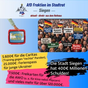 Siegen ächzt unter explodierenden Sozialausgaben und macht neue Schulden – da ist jeder Euro für „Kulturcafé“ oder „Argumentationstraining gegen rechte Parolen“ ein Skandal. warum eigentlich kein Training gegen linke Phrasen oder dringend notwendig gegen Islamismus? Das ist keine neutrale Sozialarbeit, sondern subventionierte politische Indoktrination.